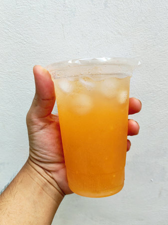 A hand holds a clear plastic cup of iced orange juice, a refreshing and cool drink for a hot summer day, against a white background.