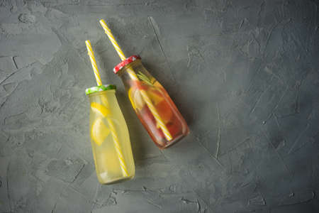 Colorful soft drinks for summer on gray background