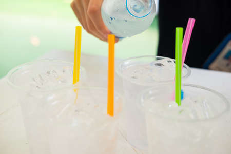 pouring water many transparent plastic cups with straw