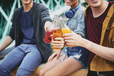 Picnic theme: group of friends holding drinks, toast , close-up