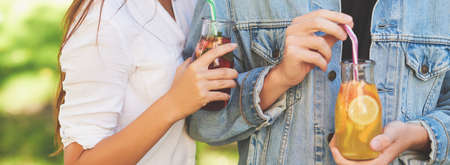 Close up of female hands holding glass jars with refreshing summer drinks.