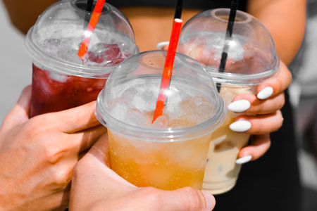 People's hands holding disposable cups with fresh juice, close-up. Company of people click glasses, selective focus. Refreshing drinks