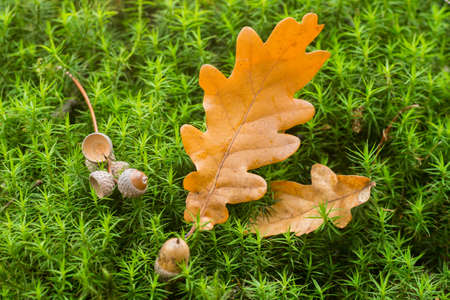 acorn lies on the moss of the autumn forest