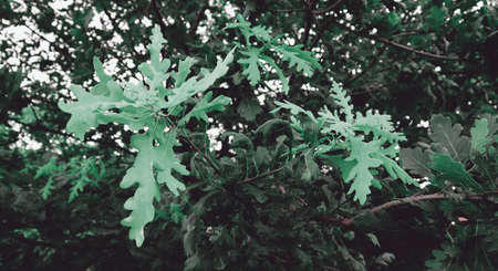 Beautiful green leaves texture. Nature background with oak tree