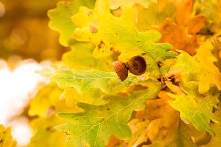 Nature background with acorn, oak leaves and bokeh light