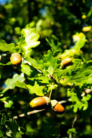 Acorns. Closeup acorns fruits in the oak nut tree against blurred green background.