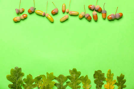 Branch with oak tree leaves and acorns on colored background, close up top view.