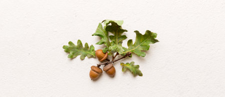 Branch with green oak tree leaves and acorns on colored background, close up top view.Branch with green oak tree leaves and acorns on colored background, close up top view.