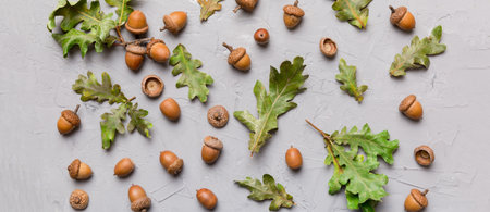 Acorns, leaves and acorns on grey background, flat lay.ai generated