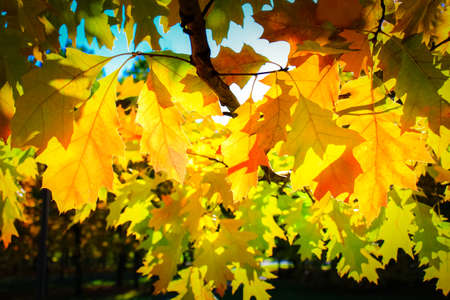 oak branches in autumn. bright foliage in the sun. autumn landscape, nature background