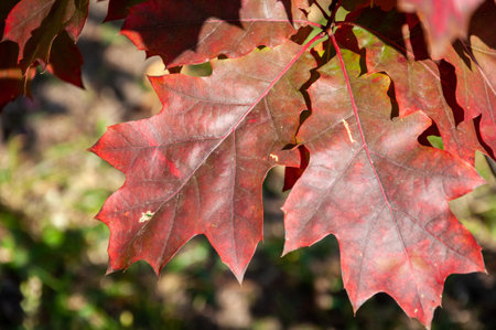 Dark red autumn leaves of the red northern oak on branch in sunny weather on a blurred background, close-up in selective focus