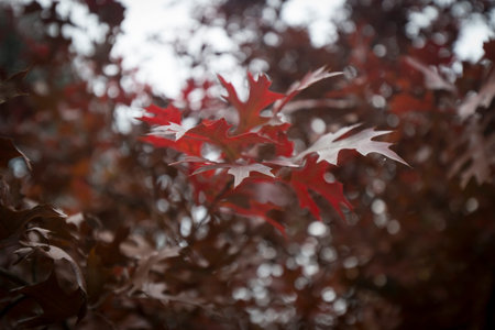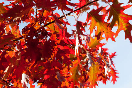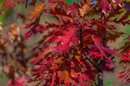 The reddened oak foliage on the branches is an oak tree, autumn bright colorful nature