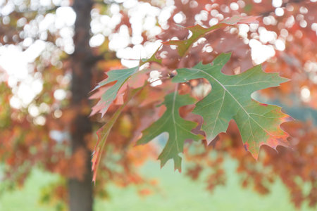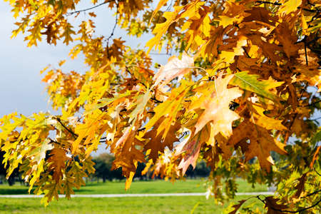 beautiful reddening oak foliage in the autumn season, especially the autumn season on the example of trees in the park or forest