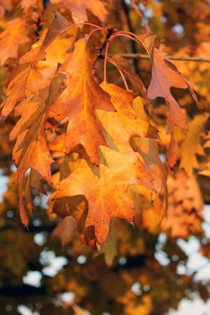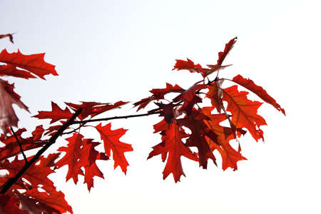 Branch of red oak with autumn bright leaves on a background of sky in backlight, background