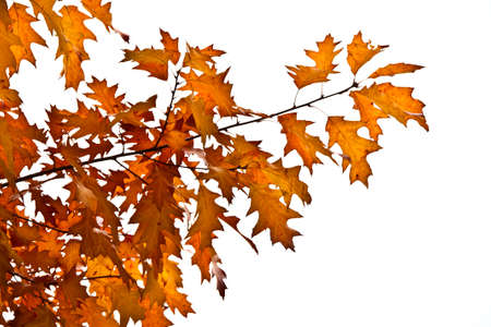 Oak branch with orange leaves in the forest in autumn. Nature background