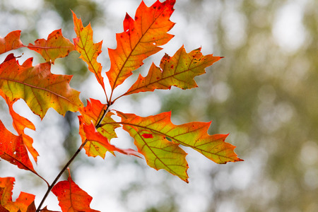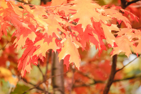 Branch of red oak with autumn bright leaves on a blurred background of other trees in forest in backlight, background