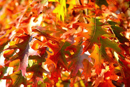 Bright red and orange oak leaves on a branch bathed in warm sunlight during the autumn season