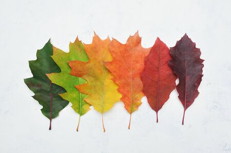 Autumn, fall and minimal composition. Beautiful branch with yellow, orange and green oak leaves. Fall concept and natural background.