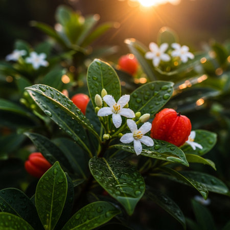 Close-up captures vibrant orange flowers and dark green leaves in a lush outdoor setting