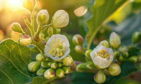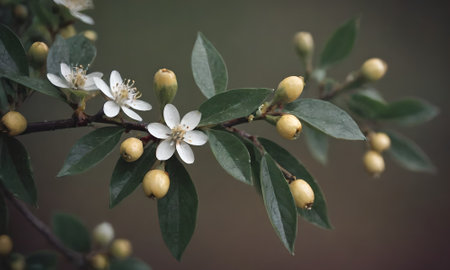 Natal plum, or Carissa macrocarpa white flowers and green fruits. Square frame