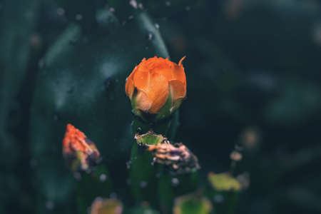 beautiful orange prickly pear cactus flower on a background of green in the garden