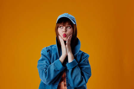 Portrait of a charming lady denim cap red lips glamor fashion yellow background unaltered