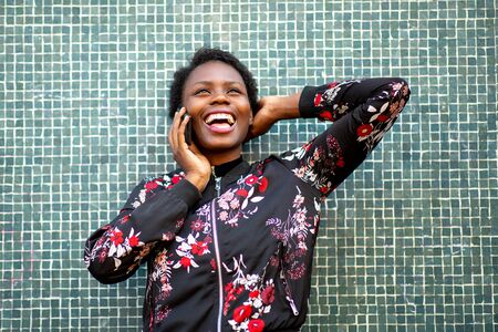 Close up front portrait happy african woman leaning against wall talking with mobile phone