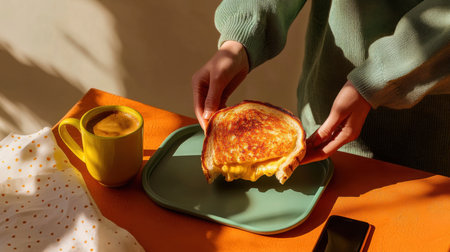 Hands hold a hot grilled cheese sandwich over a plate next to fresh espresso, basking in golden light, evoking a cozy, modern morning breakfast scene