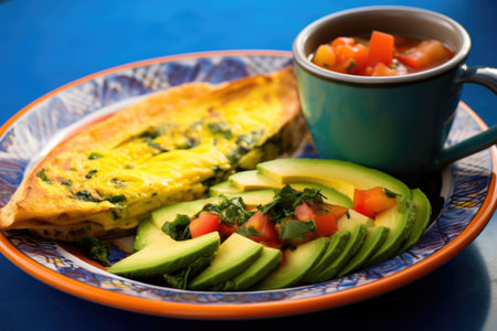 veggie omelette with avocados and toast on a blue platter, created with generative ai