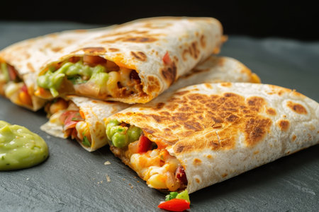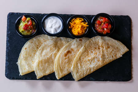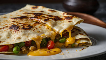 Traditional mexican quesadilla with vegetables and cheese on wooden board