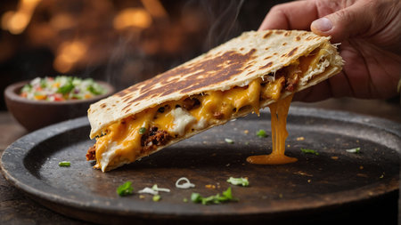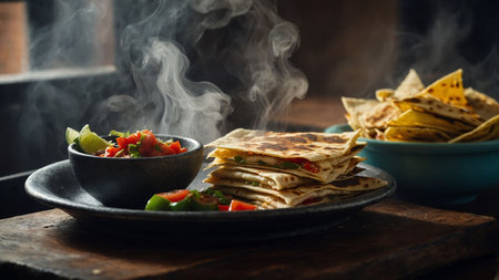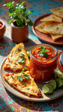 Cheesy quesadillas with spicy salsa and lime on colorful table setting. That the image is generated using AI.