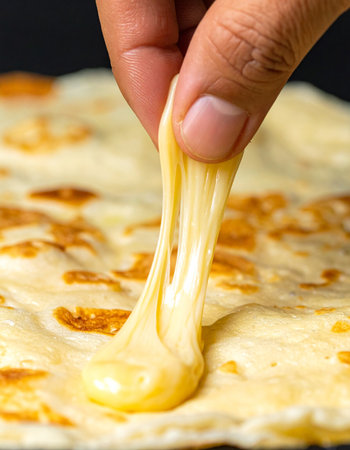 A close-up shot captures the irresistible moment of a hand pulling a piece of hot, gooey melted cheese from a freshly baked flatbread.