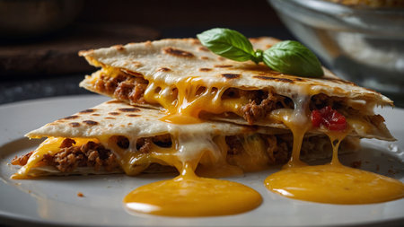 Mexican quesadilla with beef, cheese and onion on wooden background
