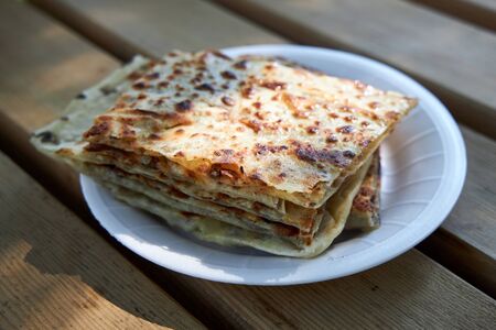 Appetizing crispy turkish tortillas with filling lie on a plate.