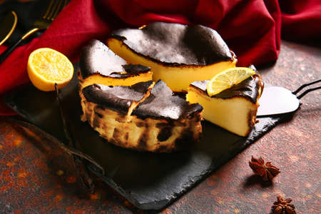 Delicious cheesecake with salted caramel on a background of black stylish dishes.