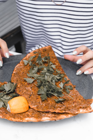 Traditional turkish baked dish pide. Turkish pizza pide, Middle eastern appetizers. Turkish cuisine. Pita with meat filling