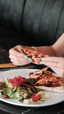 Woman is eating adjarian khachapuri with hands, crushing egg yolk.