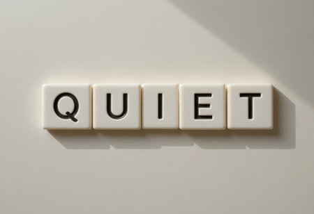 A minimalist image featuring bold letter tiles spelling out the word quiet, showcasing a calm aesthetic ideal for promoting tranquility and focus in various environments.