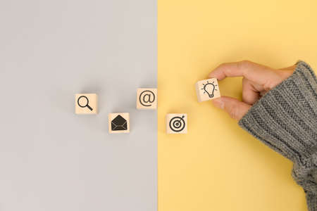 Businessman hand arranging wood block with icon business idea