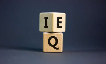 Wooden cubes with the expression 'IQ' 'Intelligence Quotient' to 'EQ' 'Emotional Quotient'. Beautiful gray background. Copy space. Concept.