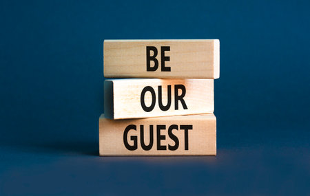 Be our guest symbol. Concept words Be our guest on beautiful wooden block. Beautiful gray table gray background. Business and be our guest concept. Copy space.