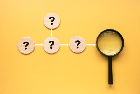 Scattered question marks. Curiosity and exploration. Search an answer by facts. Analysis gathering facts and generalization. Cooperation of forces for resolution. Induction and deduction