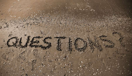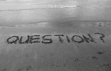 Word QUESTIONS text in large letters on the sand of the sea in summer with sepia toned effect