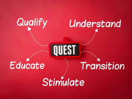 Wooden board with word QUEST on a red background. Copywriting formula concept.