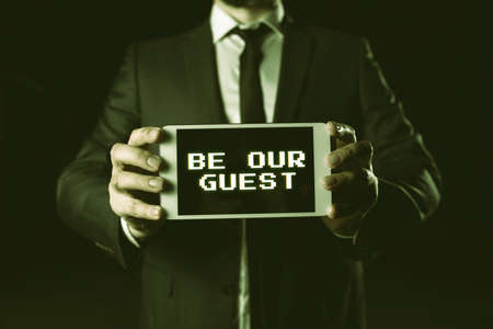 Text showing inspiration Be Our Guest. Word for You are welcome to stay with us Invitation Hospitality Businessman Presenting Important Informations On Phone Screen.