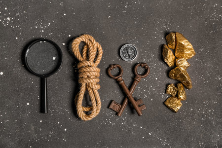 black magnifier on a brown background and question marks. The concept of uncertainty and the search for solutions, doubts, flat lay