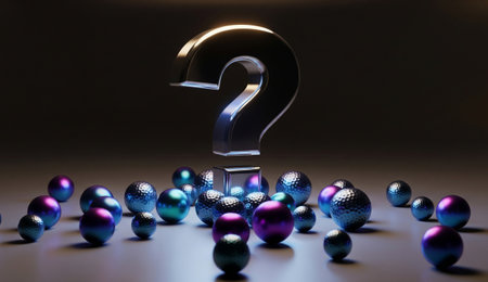 a question mark hovers above a cube, surrounded by colorful spheres on a reflective surface in a dark environment