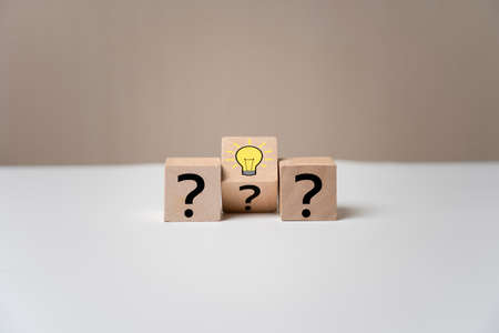 a question mark on wooden cubes. FAQ frequency asked questions, Answer and Brainstorming Concepts