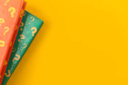 Education flat lay background with books and question sign, yellow desktop with copy space, top view