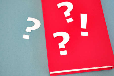 question marks and exclamation mark next to a book on a textured paper background. the book is incomprehensible and it is unknown why a lot of criticism was written